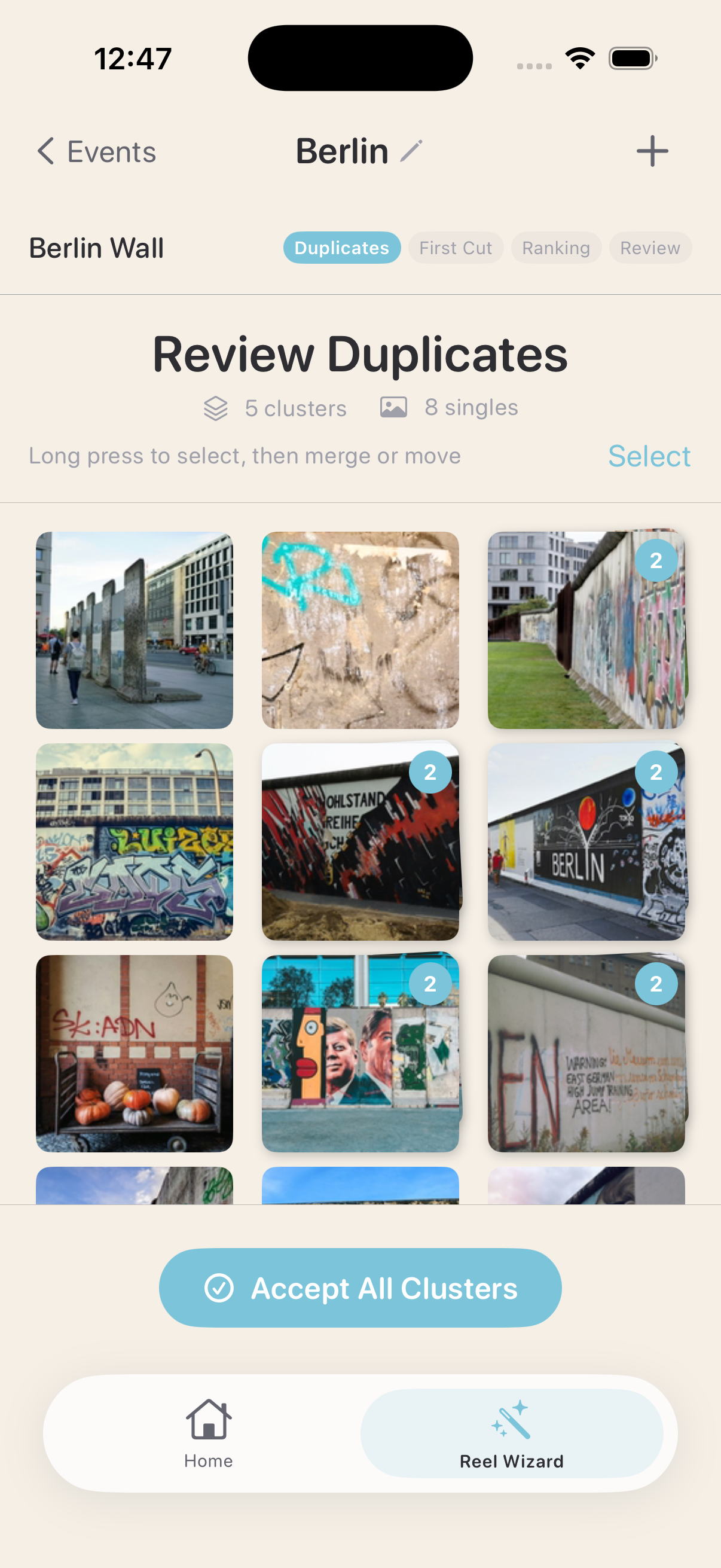 Smart grouping finds similar photos so you can pick the best from each burst.